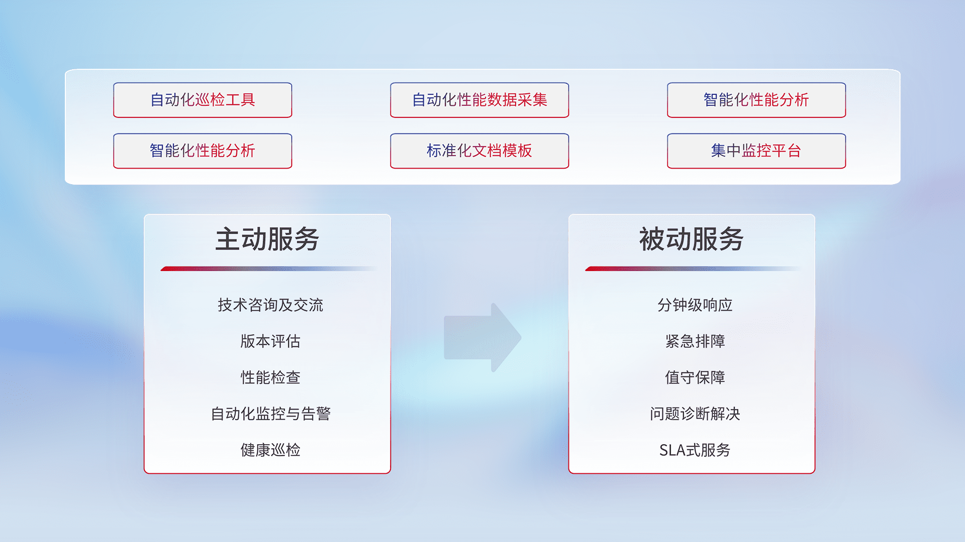 智能化工具和标准化文档,,,,保障服务质量,,,提供主动服务(包含技术咨询、、、版本评估、、、、性能检查、、、、自动化监控与告警、、健康巡检)和被动服务包含(分钟级响应、、、紧急排障、、、、值守保障、、、、问题诊断解决、、、SLA服务)。。